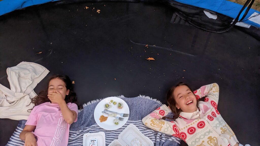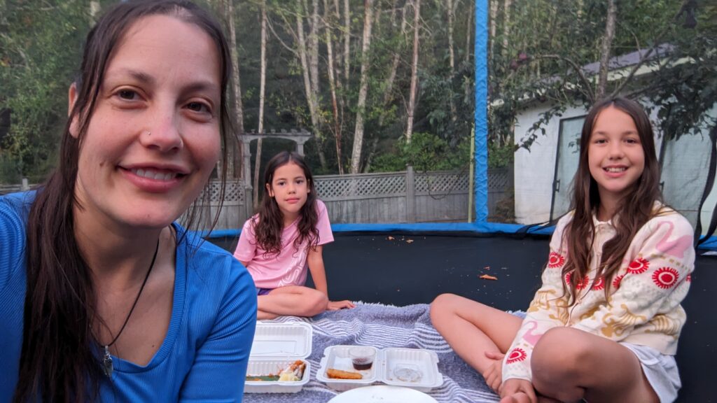 Last night, instead of eating at the dining table, I had dinner with my kids out on the trampoline. Our dining room is still in pieces from scrubbing, priming, and painting, so we decided to turn a bad situation into something fun.