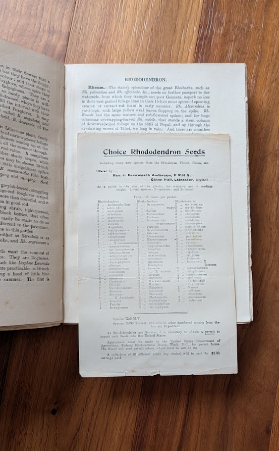 Also present is a laid-in piece of period ephemera: a printed seed advertisement titled “Choice Rhododendron Seeds,” offering alpine and Himalayan varieties, including species from the Himalayas, Thibet, and China, issued by Rev. J. Farnworth Anderson of Glen Hall, Leicester, England, priced at 15 cents per packet. While not known to have been issued with the book, it is a fitting contemporary insert that closely reflects the plant-collecting world in which Farrer was writing.