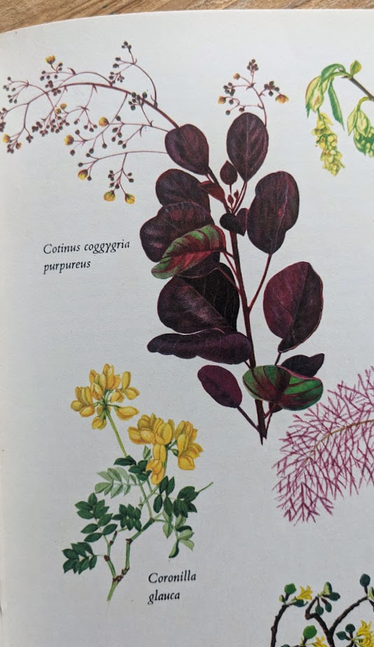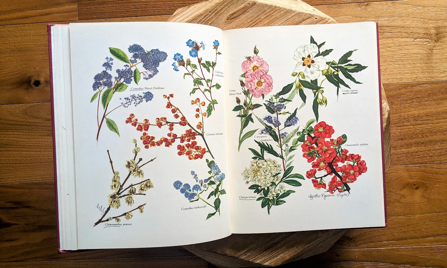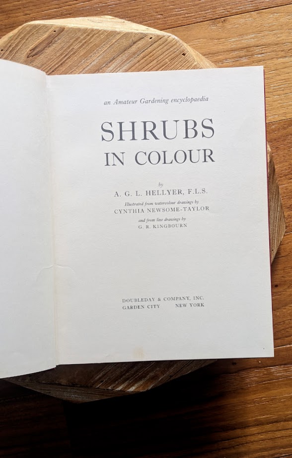 Shrubs in Colour by A. G. L. Hellyer, illustrated with watercolour plates by Cynthia Newsome-Taylor and line drawings by G. R. Kingbourn.